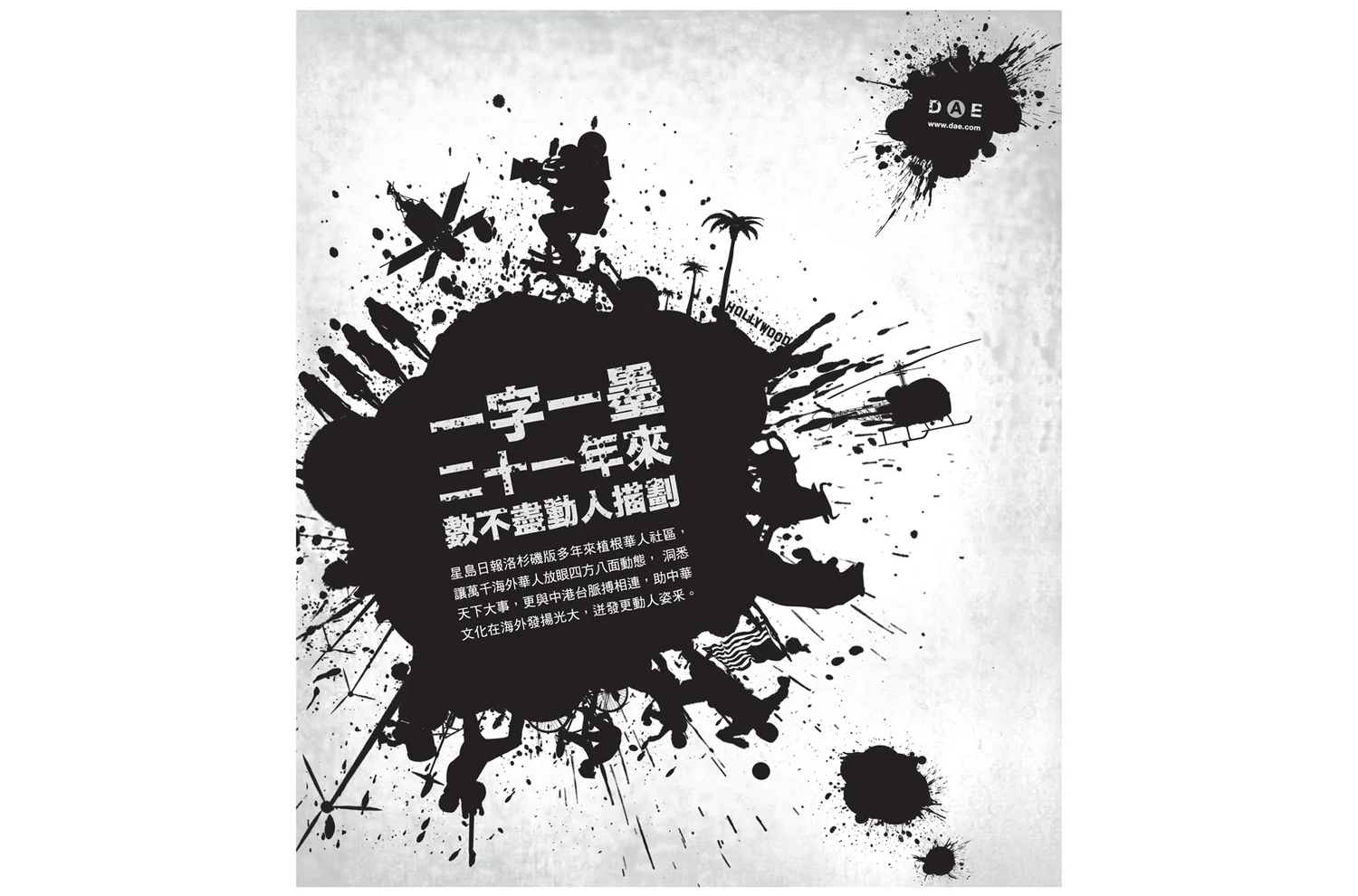 English Back Translation: Sing Tao LA [Ink Splash]: For 21 years, countless charming stories were depicted in each word and every drop of the ink.