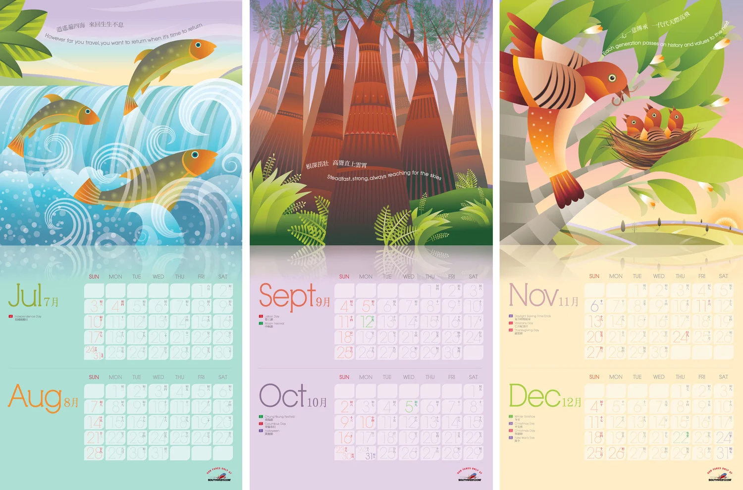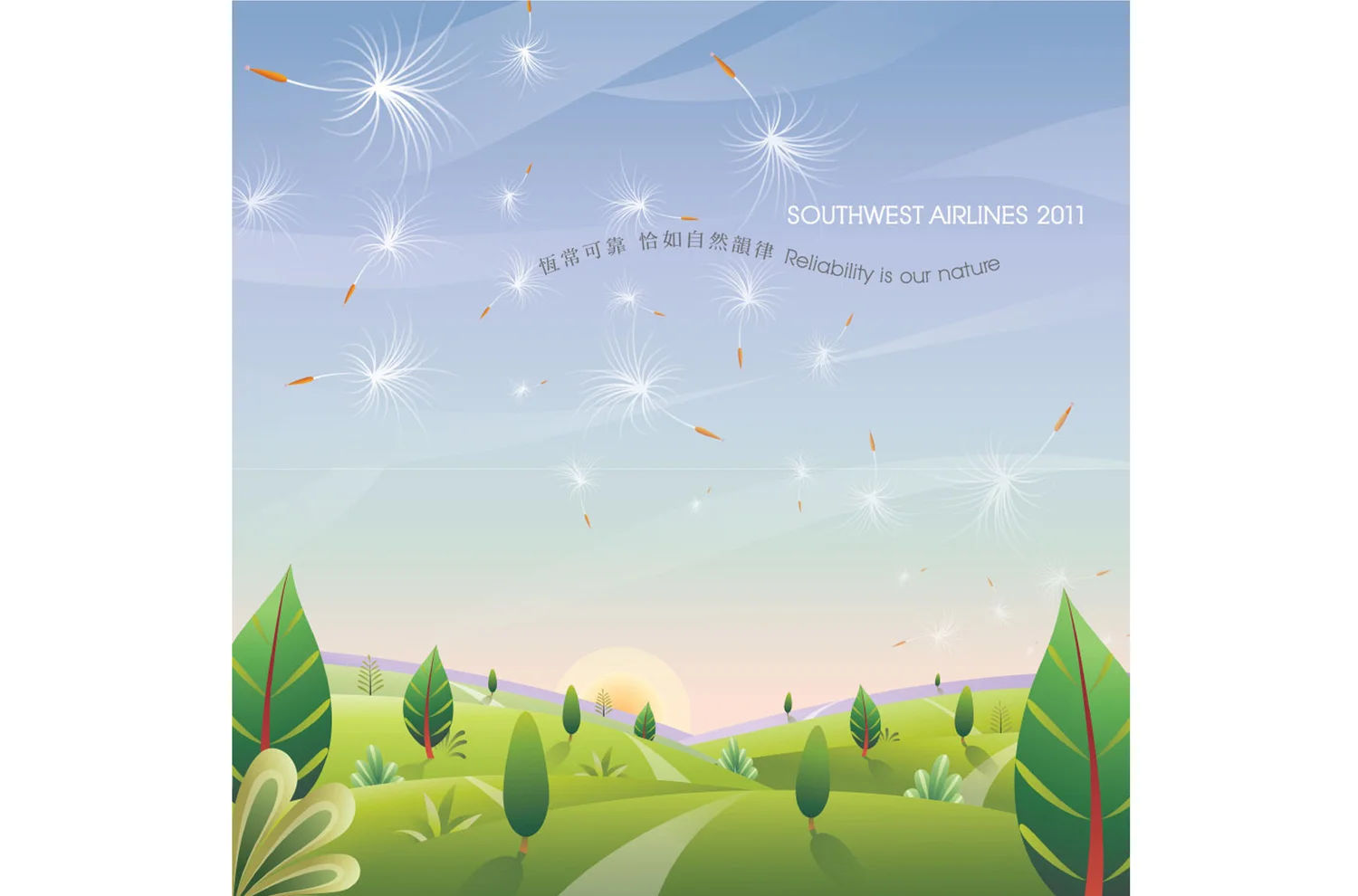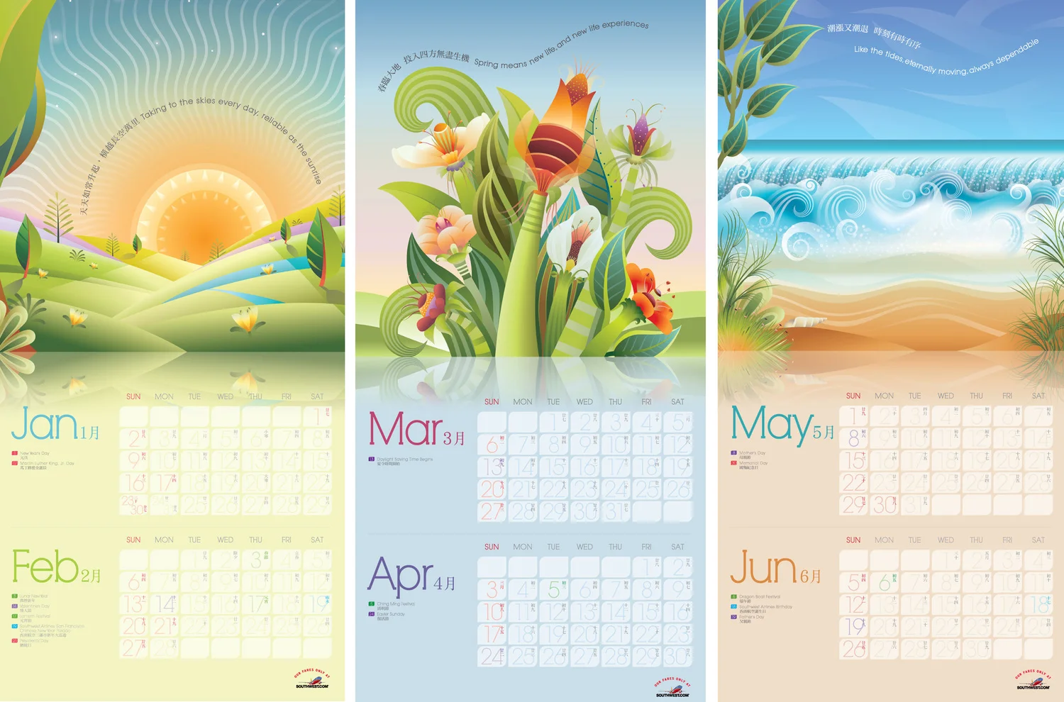 In order to reinforce the current Southwest Airelines positioning: “Count On Us”, we created a festive full year calendar for 2011 called “Reliability is Our Nature”. Using nature’s rhythms as visuals and bilingual copy to encompass the Southwest spirit.